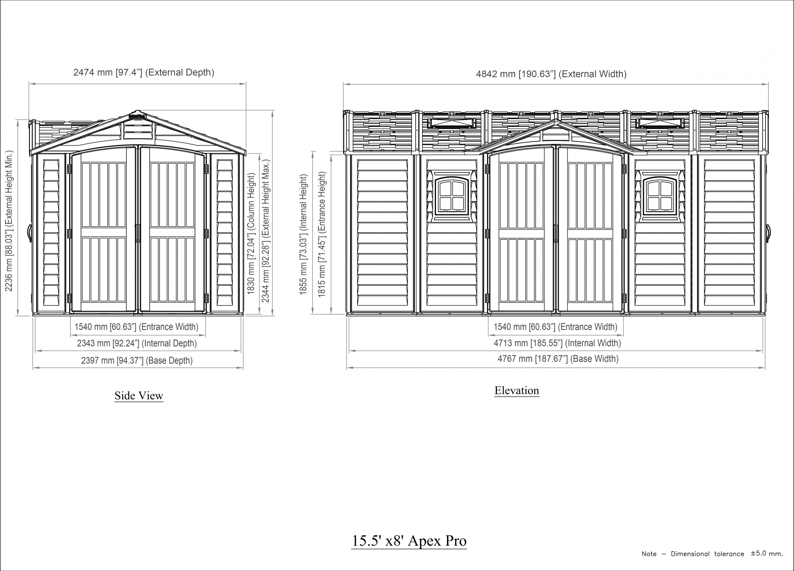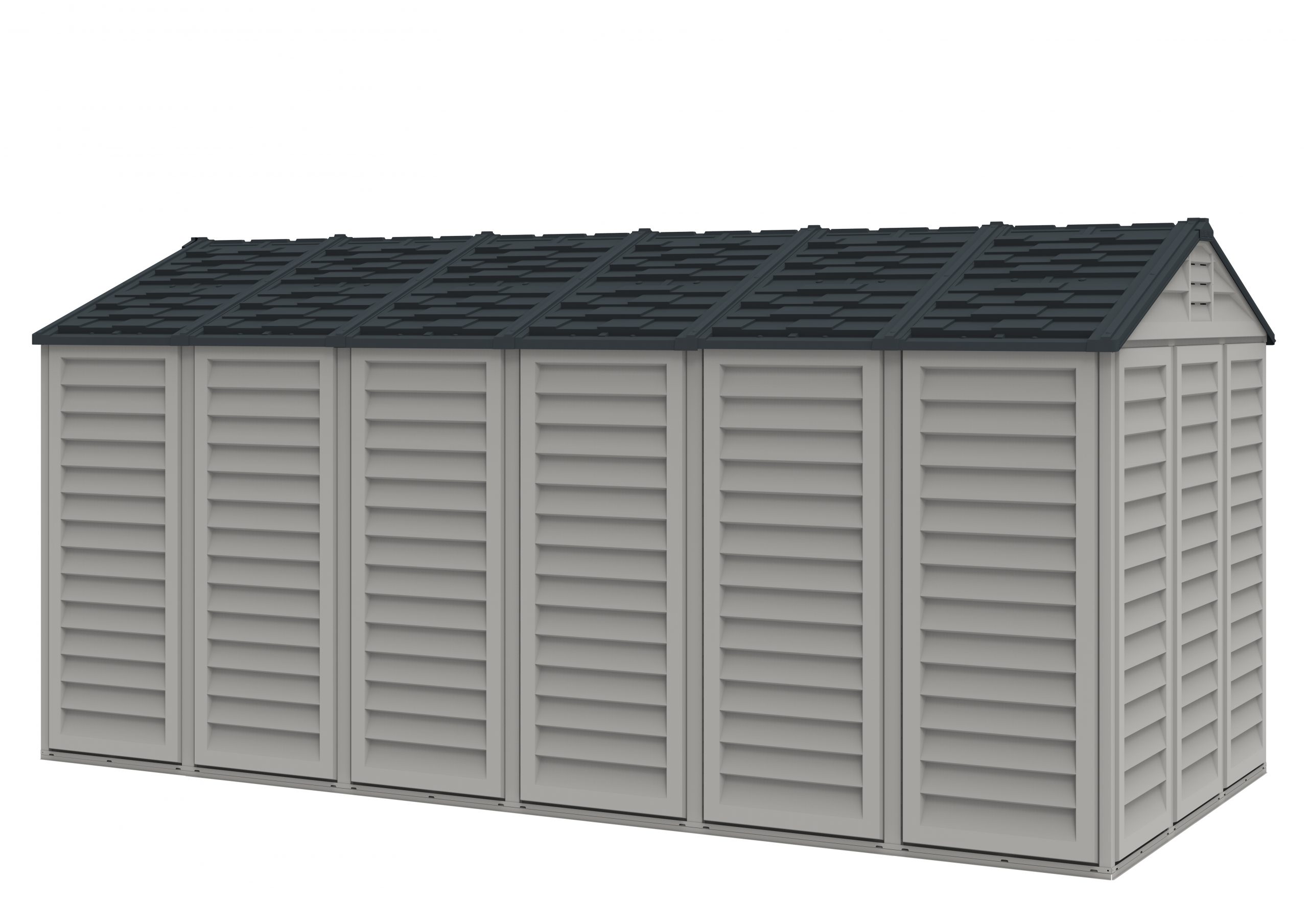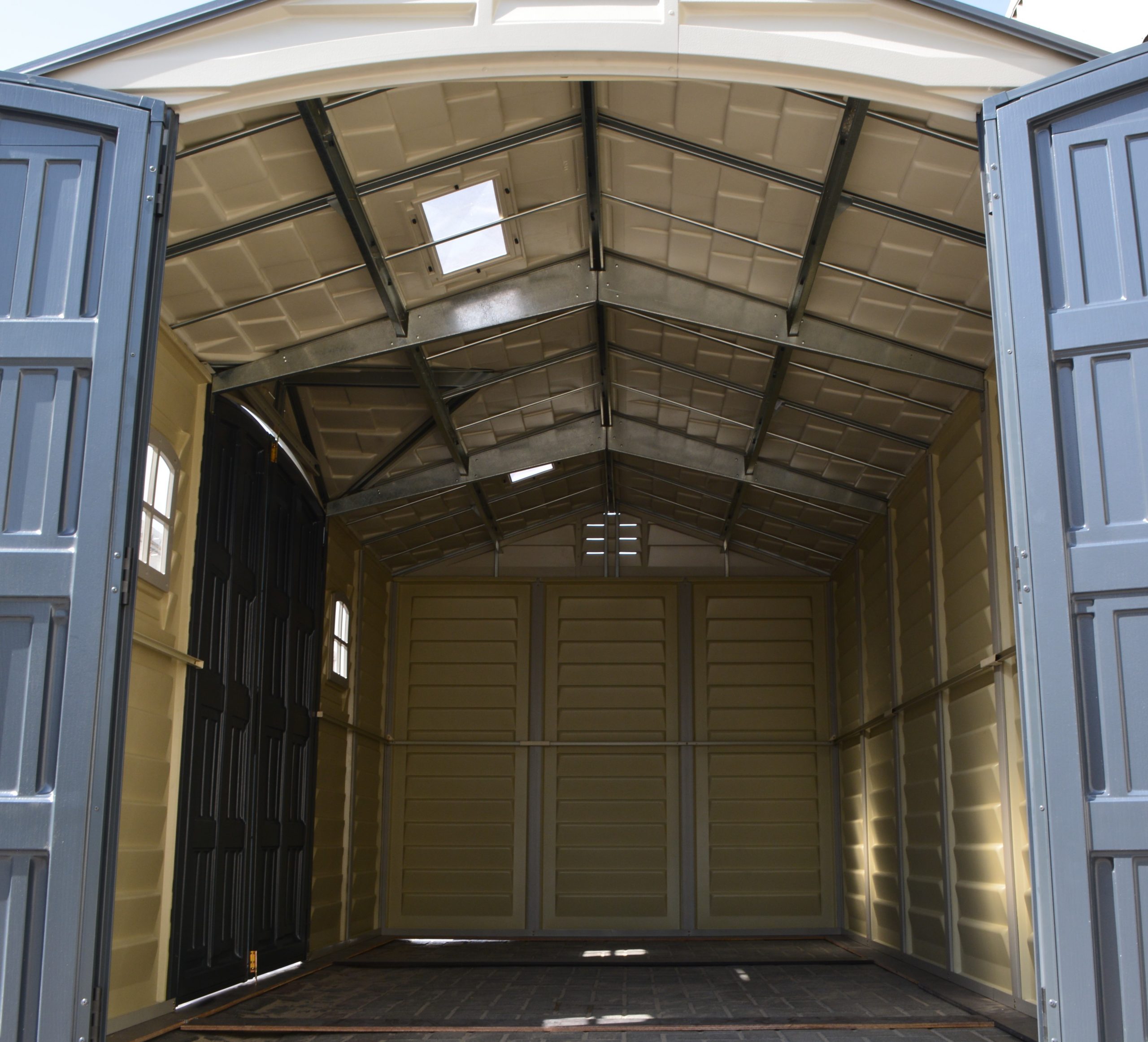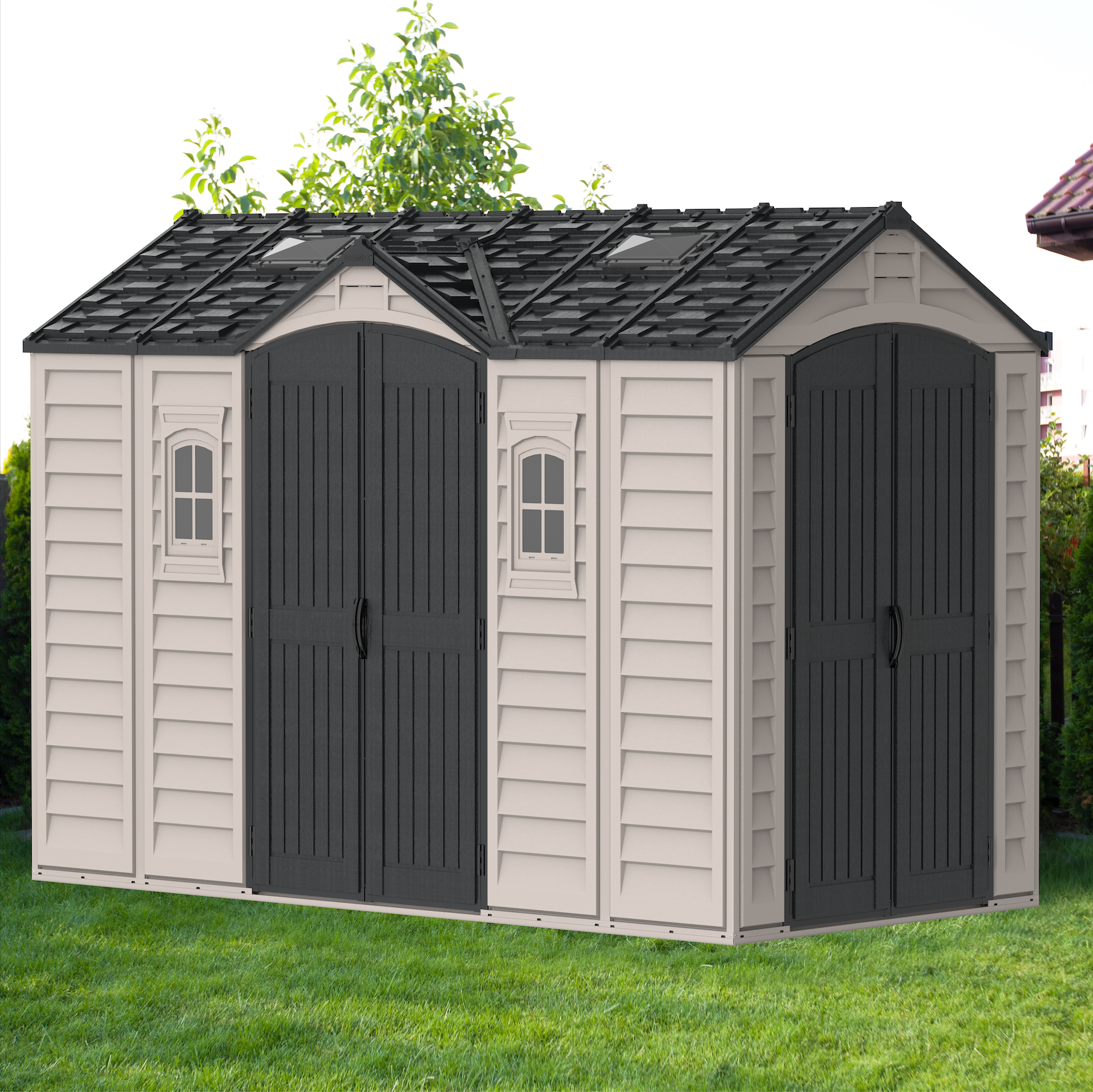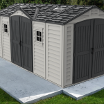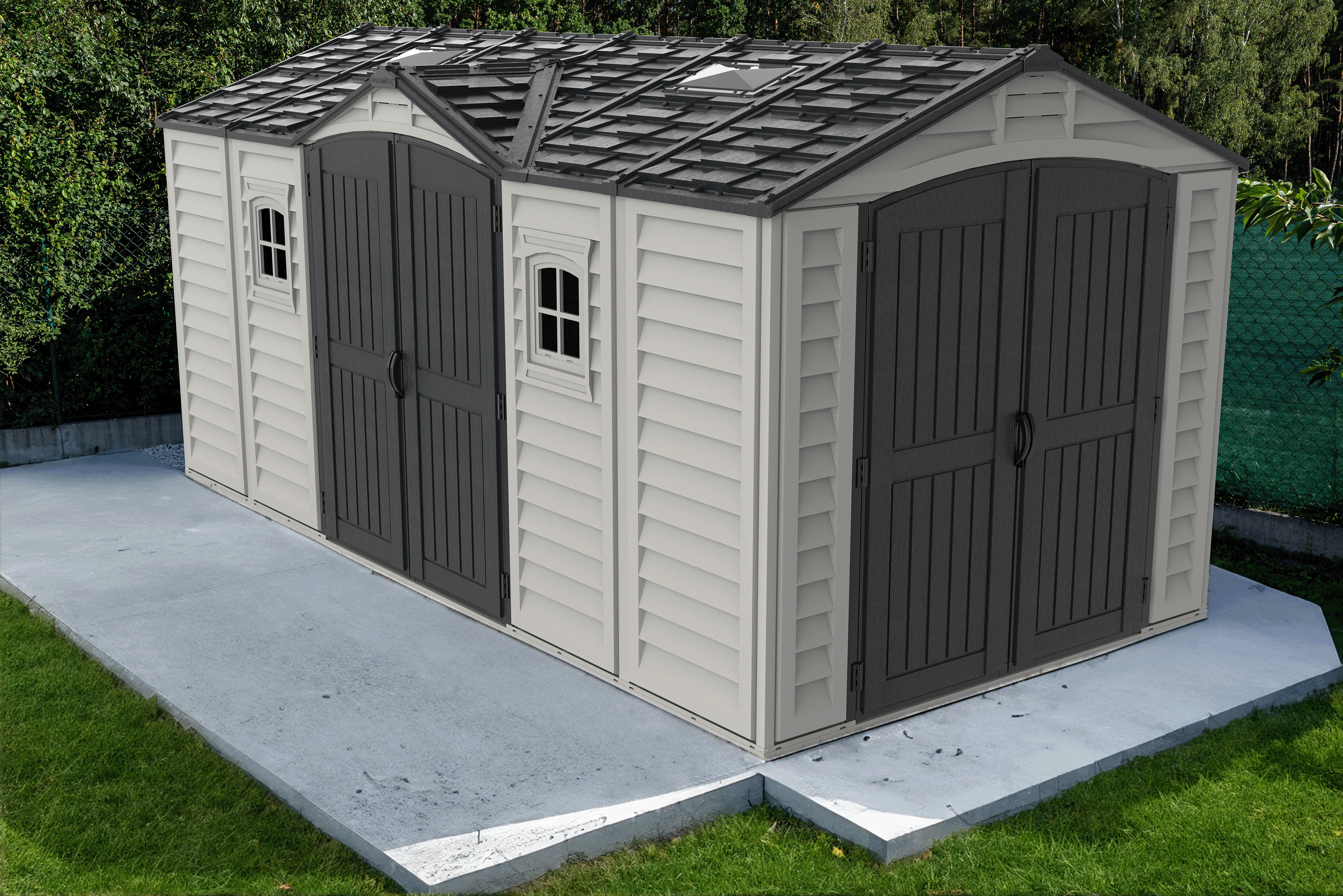 The Apex Pro is the latest line of quality sheds produced under the Duramax brand. The brand Duramax to signify DURability and MAXimum quality and value. The Apex Pro has large double entry and double side doors.This provides storage accessibility from either side of the shed, insuring maximum utilization of storage and is easier to acquire the stored equipment. The Apex Pro was attractively designed to add beauty and blend into any yard area. The Apex Pro is maintenance free. It never needs painting and won't rust, rot or dent and is impervious to wood eating insects. This shed has two creatively designed skylights on the roof and two front windows for light control and has four slotted vents for air flow.The Apex Pro has more of the physical characteristics of a house than a shed. The fire retardant vinyl resin panels are supported by Heavy Duty interior galvanized steel columns, beams and trusses for strength and roof snow load. Vinyl unlike polyethylene is fire retardant and safe to store all your flammable items. The 15 years warranty supports our guarantee of quality and longevity. It has a step by step instruction manual to simplify assembly. We suggest two people to facilitate assembly.